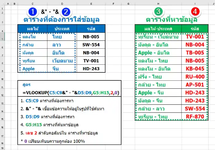 VLOOKUP (หาอะไร = โดยรวมคอลัมน์ C5:C9 กับ D5:D9, จากไหน = G5:H15, ผลลัพธ์ที่ต้องการ = คอลัมน์ที่ 2, เงื่อนไขในการเปรียบเทียบ = 0)