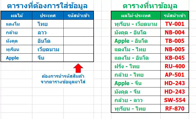 โดยโจทย์ เราต้องการนำรหัสการนำเข้าผลไม้ของประเทศต่างๆ จากตารางข้อมูล มาใส่ในตารางรายการของเรา ซึ่งในตารางข้อมูล ชื่อของผลไม้และชื่อประเทศ นั้นอยู่รวมในช่องเดียวกันและมีเครื่องหมายขีดคั่นตรงกลาง แต่ตารางรายการที่เราจะใส่ข้อมูล ชื่อผลไม้ แยกกันอยู่คนละช่อง